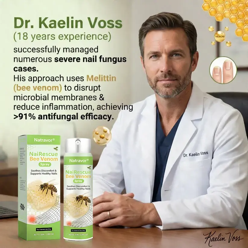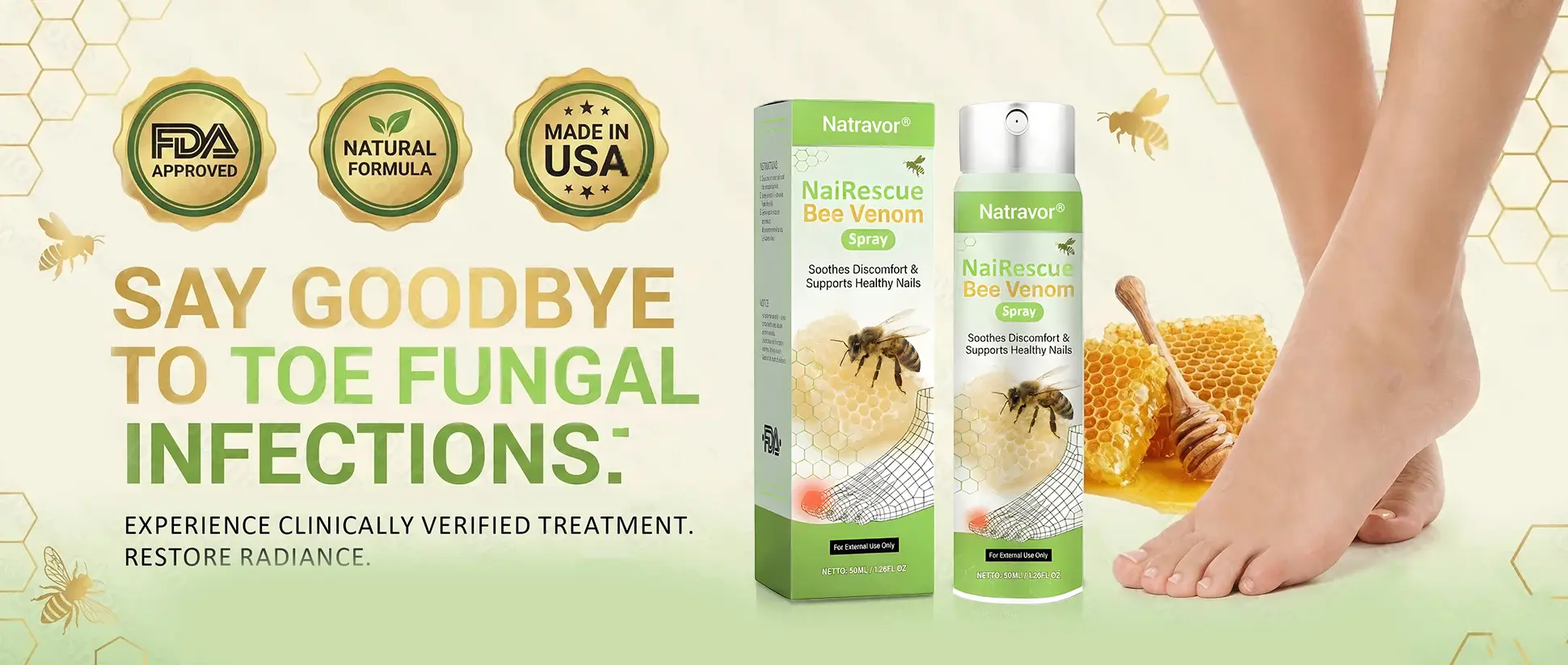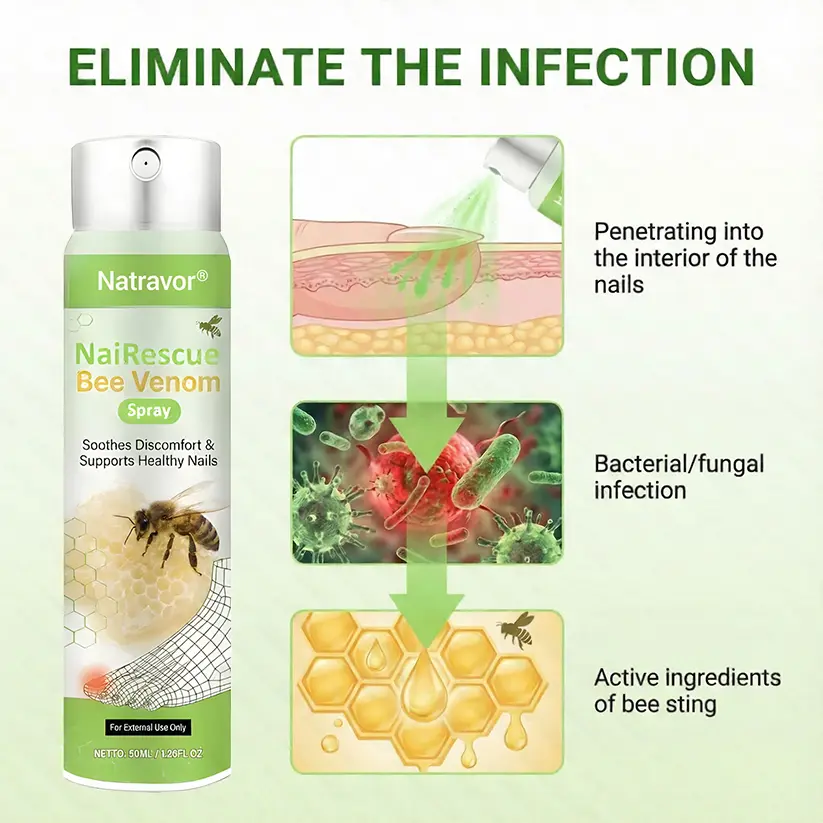 Natravor® NaiRescue Bee Venom Spray has powerful antifungal efficacy, which can penetrate deep into the nail bed to eliminate stubborn fungal infections. Its unique bee venom complex and medical-grade antifungal ingredients work synergistically—not only to eliminate existing pathogens, but also to strengthen the nail structure and prevent future re-infections.Recommended by Dermatologists